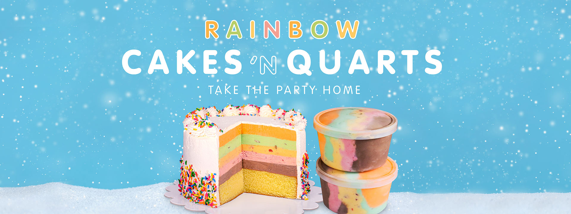 Our legendary winning combination of Rainbow Cone flavors, layered on top of a delicious cake.